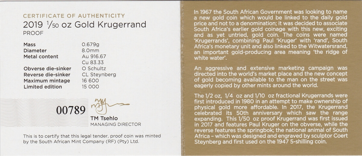 2019 South Africa Gold Proof Fiftieth Ounce Krugerrand Coin.