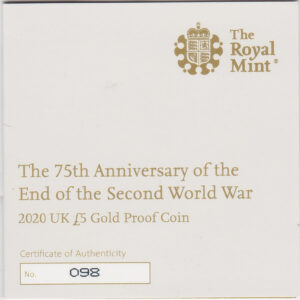 This 2020 five pounds, five sovereigns or quintuple sovereign was struck to commemorate the 75th anniversary of the end of the second world war.