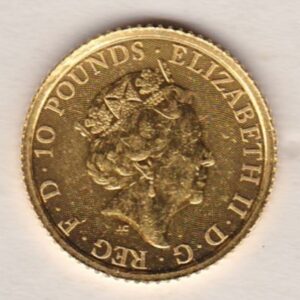 The 2020 Royal Arms tenth ounce coin was struck by the Royal Mint. The coin features the portrait of Queen Elizabeth II on the Obverse.  The reverse of this coin depicts the Royal Coat Of Arms, with date above and gold content below.