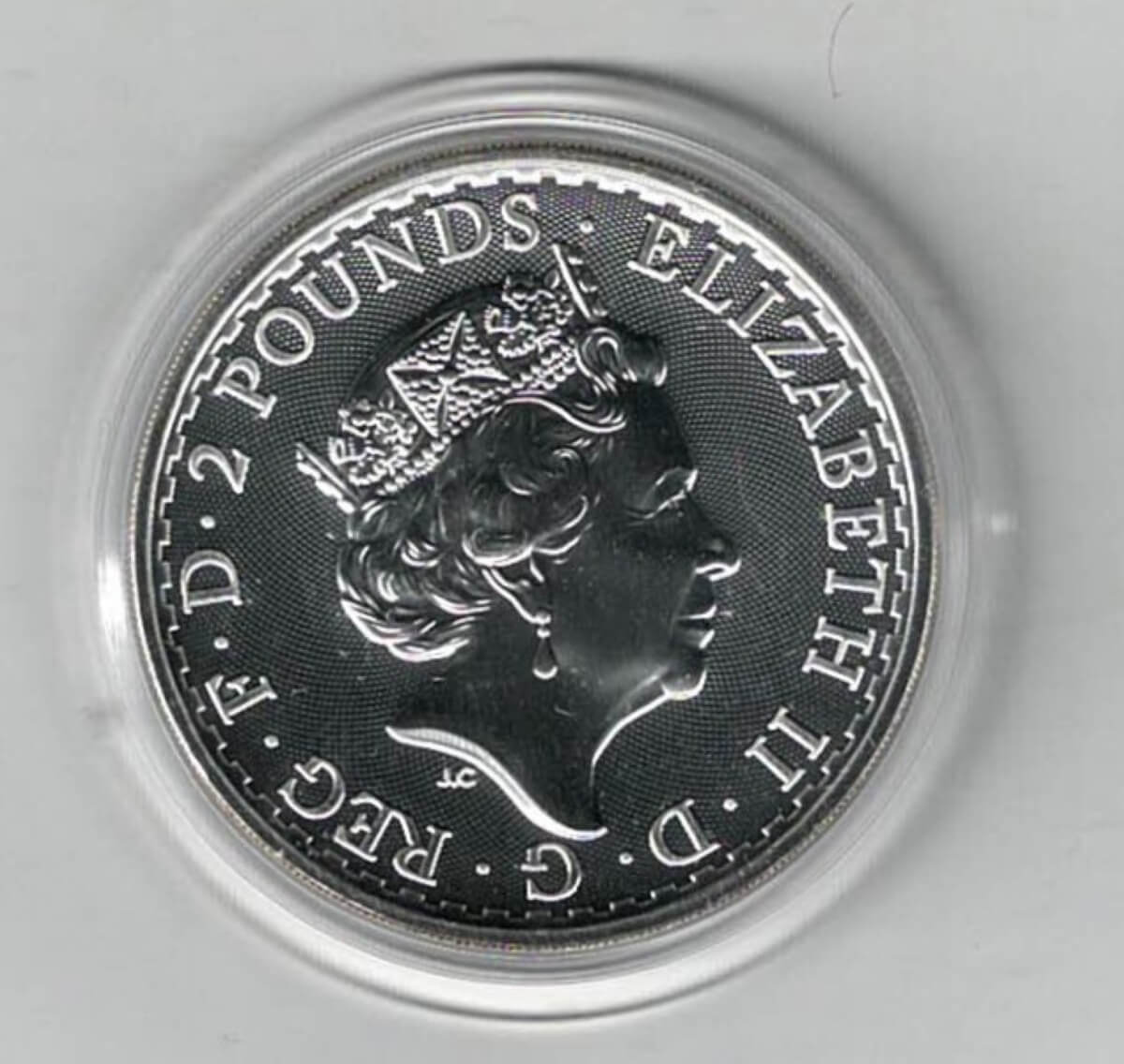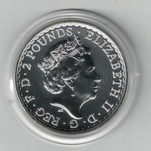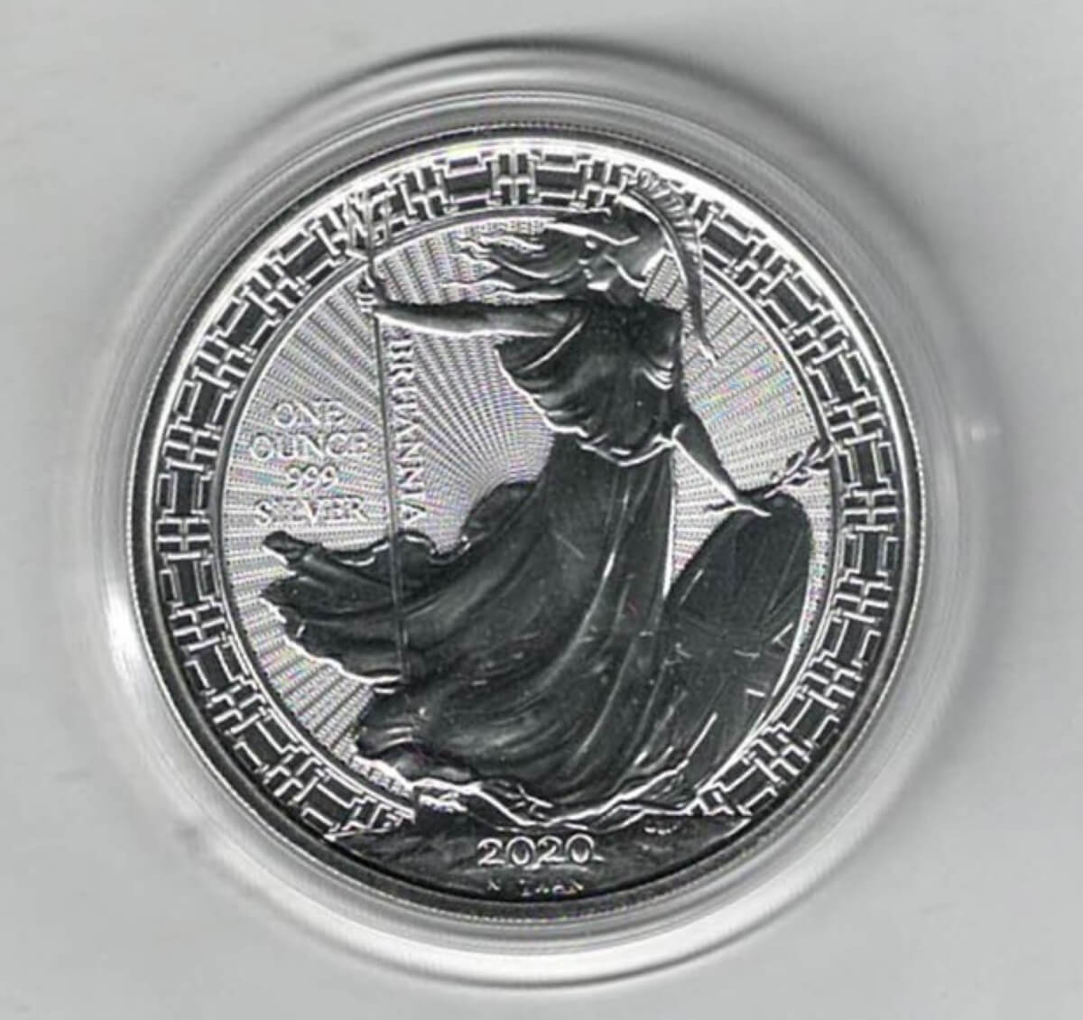 The 2020 Britannia is a coin struck in fine silver by the Royal Mint. The obverse features the fifth crowned portrait of HM Queen Elizabeth II facing to the right. The reverse features a Standing figure of Britannia with trident and shield, there is an oriental boarder with legend around.
