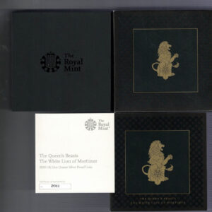 This 2020 The Queen’s beasts coin is struck in fine silver with a proof finish by the Royal Mint. The obverse features the portrait of Queen Elizabeth II facing to the right. The reverse features the White Lion of Mortimer facing right. Proof coins are hand-finished to create a flawless effect, and are often struck multiple times with specially prepared dies to achieve a mirrored finish and clarity of detail.