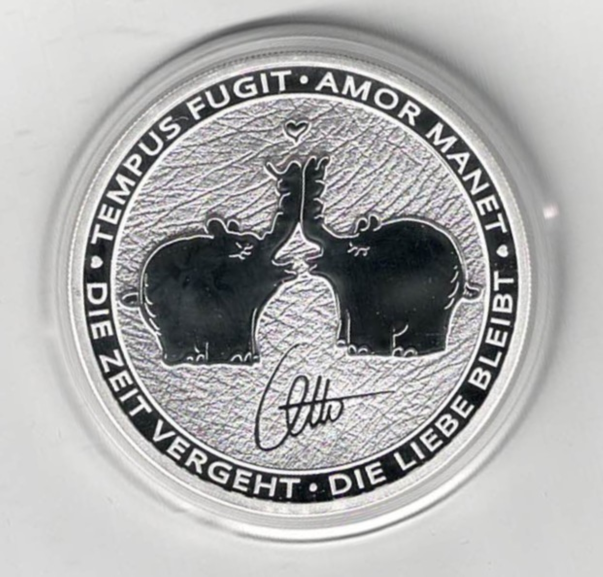 The obverse features the portrait of Queen Elizabeth II facing right. The reverse features Kissing Ottifants with heart above and signature of Otto Walkes beneath.
