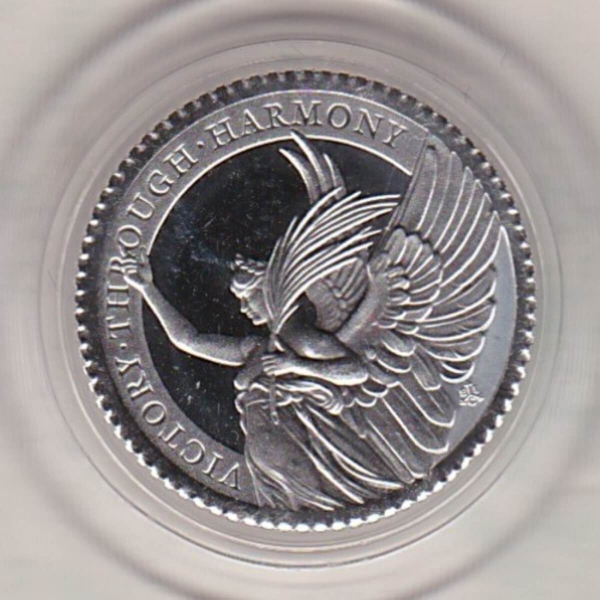 The 2021 platinum tenth ounce coin features Queen Elizabeth II on the obverse. The reverse features a depiction of the Winged Angel of Victory. She is set in left-profile relief with a palm branch in her left hand and her right hand raised up toward the heavens. There is an inscription on this face of VICTORY THROUGH HARMONY and the East India Company mark.