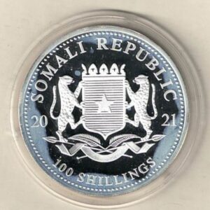 2021 Silver Somali Republic One Ounce Elephant 100 Shillings Coin in near mint condition.