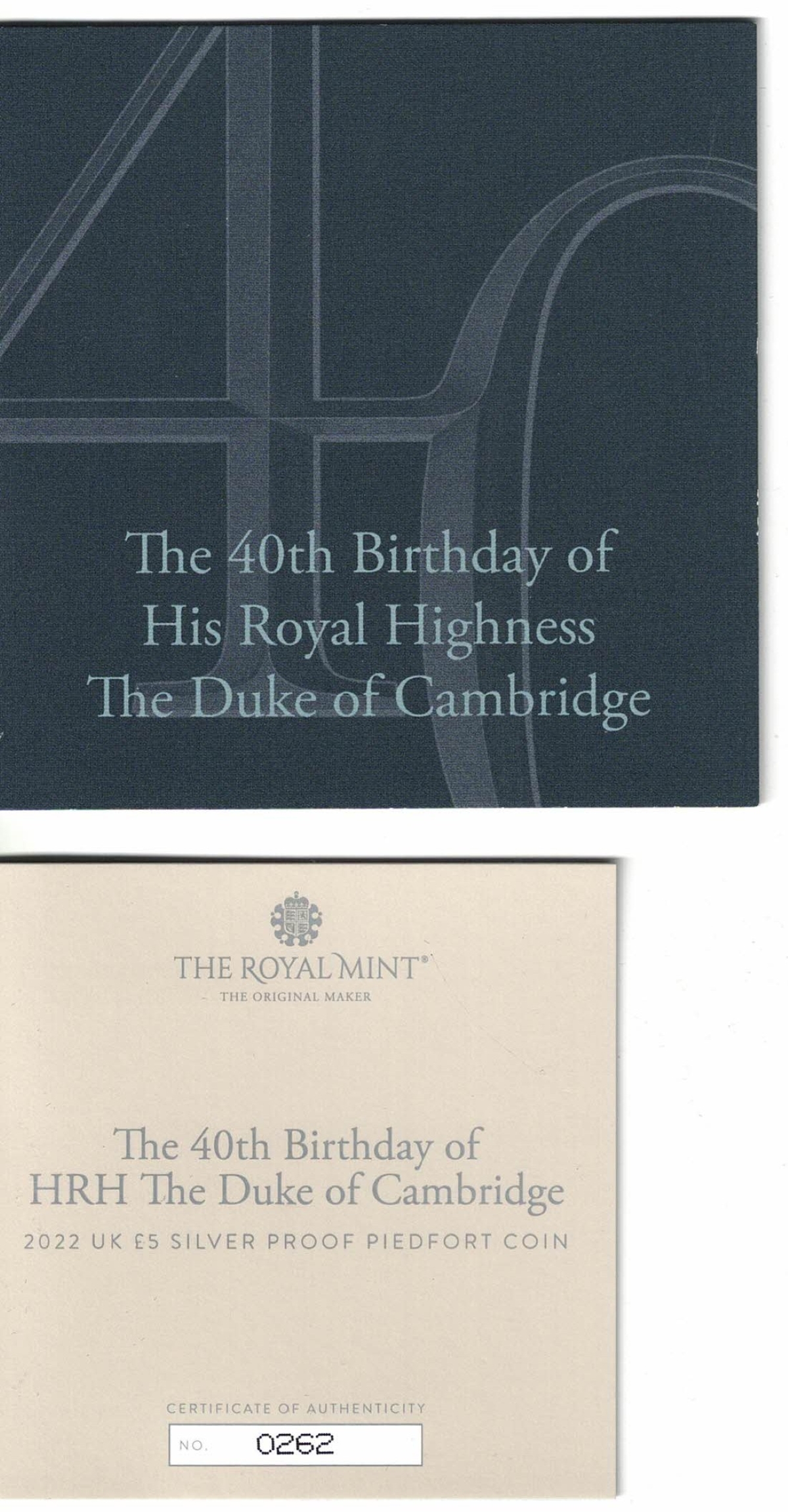 2022 Five Pounds Piedfort Silver Proof ‘The 40th Birthday of HRH The Duke of Cambridge’ Coin In Mint Condition.