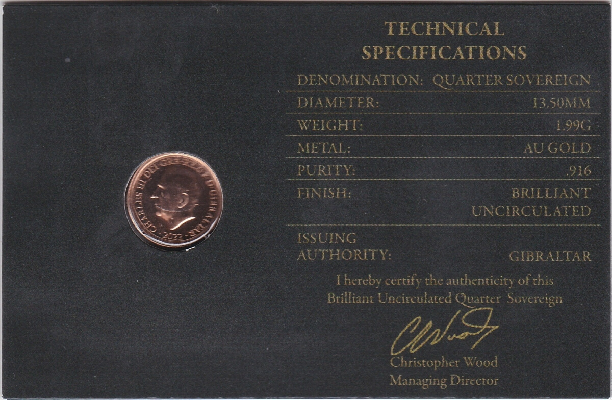 You are buying the 2022 Gibraltar Gold Quarter Sovereign coin in the pictures.