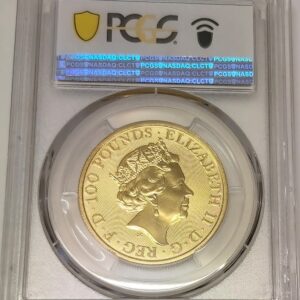 In 2022 the Roya Mint struck this gold Lion Of England one ounce design. The coin was issued as part of the Tudor Beasts series. The obverse features Queen Elizabeth II. The reverse features the Lion Of England. The Lion is holding a shield, with the legend above and date below.