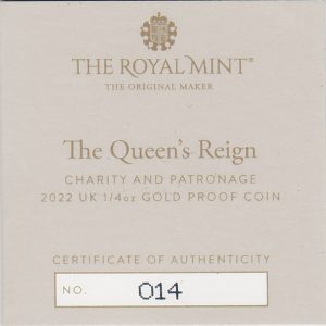 2022 Queen Elizabeth II Gold Proof Quarter Ounce Queen’s Reign Charity And Patronage coin.