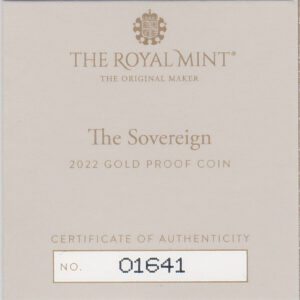 The 2022 proof sovereign is a coin struck in 22 carat gold by the Royal Mint. The obverse of this coin features the fifth crowned portrait of Queen Elizabeth II facing right, wearing the George IV State Diadem, legend around.. The reverse features the Royal Arms, at its centre a crowned and quartered shield supported by a crowned English lion on the left and a Scottish unicorn on the right, date below..