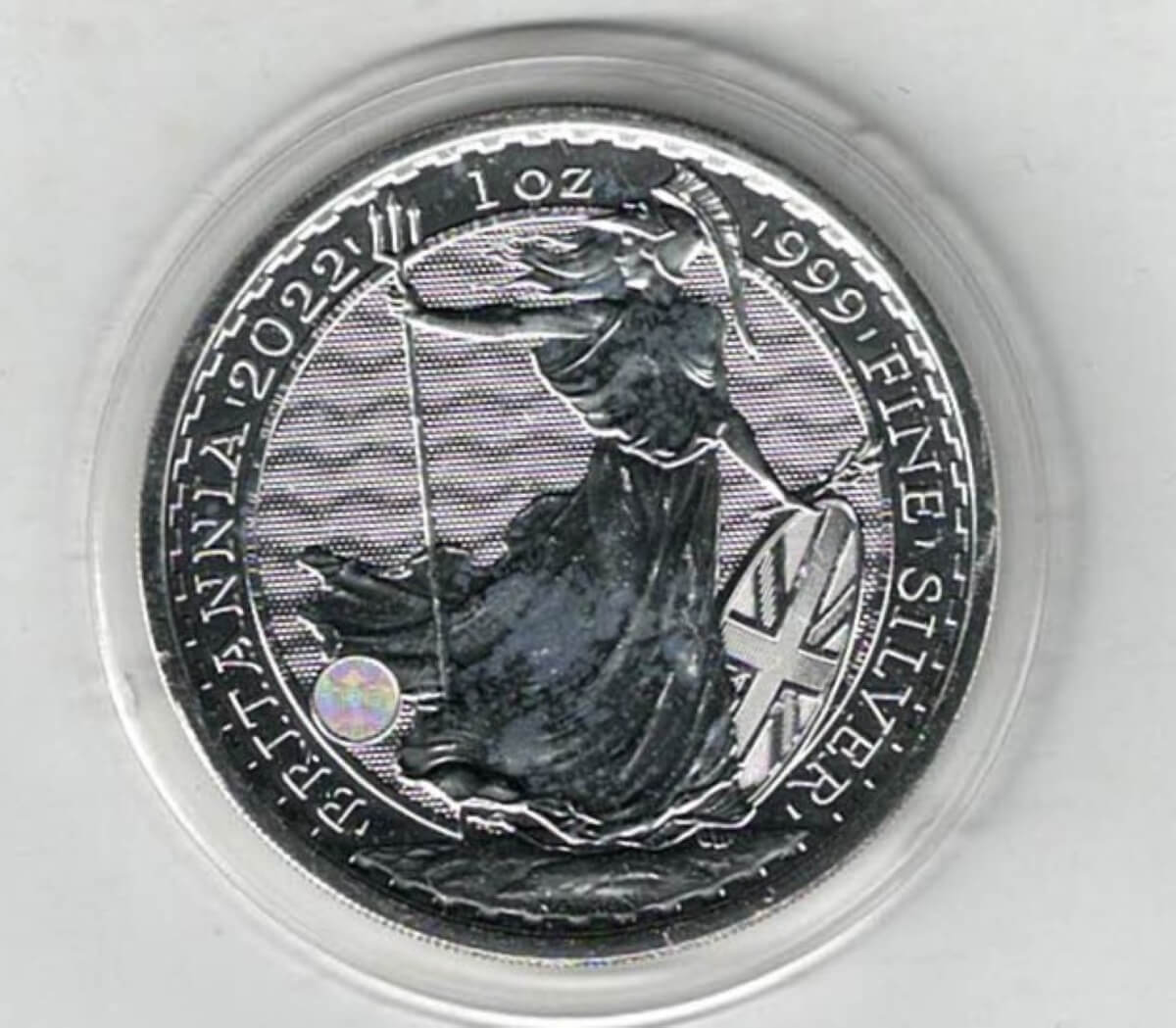 The 2022 Britannia is a coin struck in fine silver by the Royal Mint. The obverse features the fifth portrait of Queen Elizabeth II facing right. The reverse depicts a standing Britannia with shield, trident and Corinthian helmet.