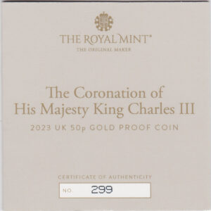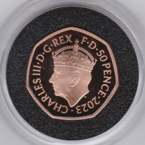The 2023 proof Fifty Pence is a coin struck in 22 carat gold by the Royal Mint. The coin was issued to celebrate the coronation of King Charles III.