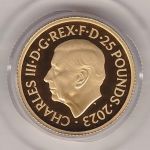 The 2023 gold quarter ounce was struck by the Royal Mint. The obverse features the uncrowned portrait of King Charles III facing left, with legend and date around. The obverse features a depiction of James Bond flying a microlight from the movie ‘You Only Live Twice’, set against a background of James Bond titles from the 1960s and the inscription ‘007’.