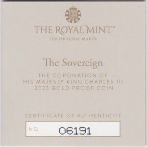 The 2023 proof sovereign is a coin struck in 22 carat gold by the Royal Mint. The obverse of this coin features the official crowned portrait of King Charles III facing left, with legend around. The reverse depicts St. George slaying the dragon, with the date and designer’s initials in exergue. Proof Sovereigns are hand-finished to create a flawless effect, and are often struck multiple times with specially prepared dies to achieve a mirrored finish and clarity of detail.