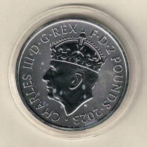 This 2023 silver one ounce coin features the crowned portrait of HM King Charles III facing left with legend around on the Obverse. The reverse of this coin is completed with the Royal cypher. This personal symbol of King Charles III has the initials ‘C’ intertwined with the letter ‘R’ for Rex (king) and the number III in the centre. Above it is the Tudor crown.