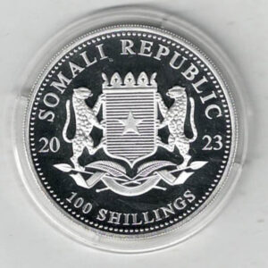 2023 Silver Somali Republic One Ounce Leopard 100 Shillings Coin In Near Mint Condition.
