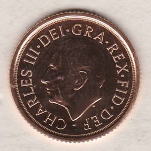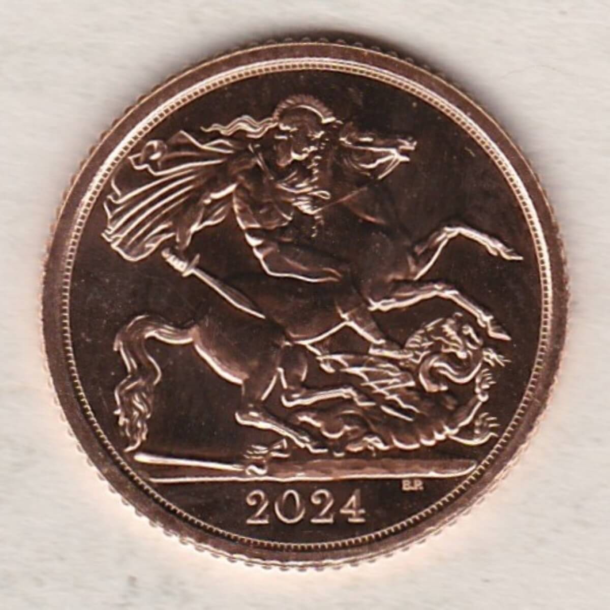 The 2024 half sovereign is a coin struck in 22 carat gold by the Royal Mint. The obverse of this coin features the portrait of King Charles III facing left, with legend around. The reverse depicts St. George slaying the dragon, with the date and designer’s initials in exergue.