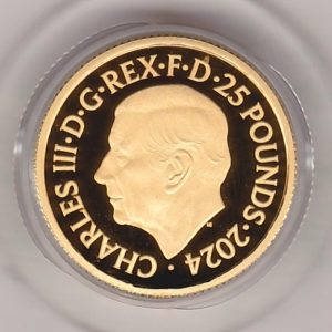 The 2024 gold quarter ounce was struck by the Royal Mint. The obverse features the uncrowned portrait of King Charles III facing left, with legend and date around. The obverse features a depiction of the hovercraft from the movie ‘Die Another Day’, set against a background of James Bond titles from the 2000s and the inscription ‘007’.