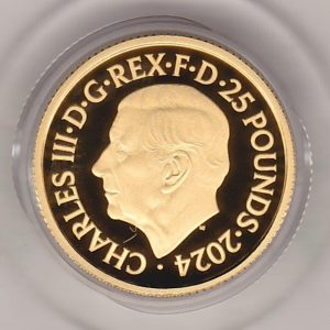 The 2024 gold quarter ounce was struck by the Royal Mint. The obverse features the uncrowned portrait of King Charles III facing left, with legend and date around. The obverse features a depiction of the snow plane from the movie ‘Spectre’, set against a background of James Bond titles from the 2010s and the inscription ‘007’.