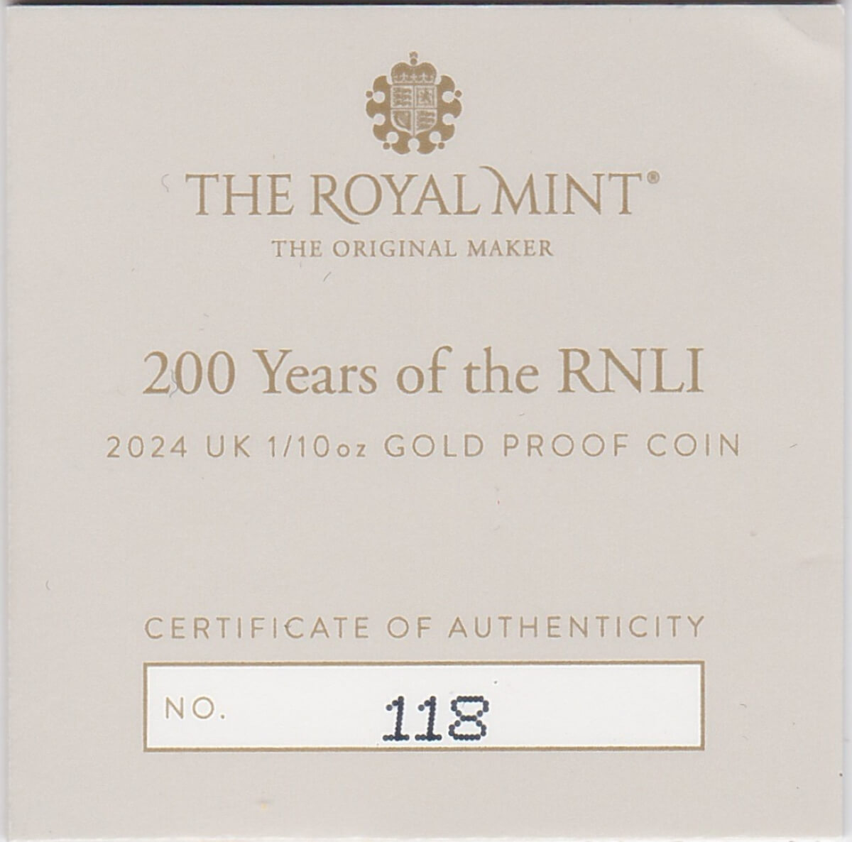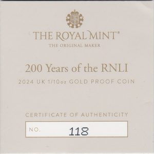 The 2024 gold tenth ounce coin was struck by the Royal Mint. The coin features King Charles III on the obverse. The reverse features the RNLI flag, with legend above, and dates below. The coin was issued to celebrate the 200th anniversary of the RNLI.