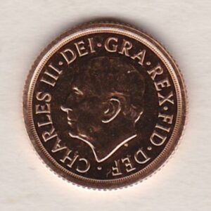 The 2009 quarter sovereign is a coin struck in 22 carat gold by the Royal Mint.  The obverse of this coin features the uncrowned portrait of King Charles III facing left, with legend around. The reverse depicts the classic St. George slaying the dragon, with date and designer’s initials in exergue.