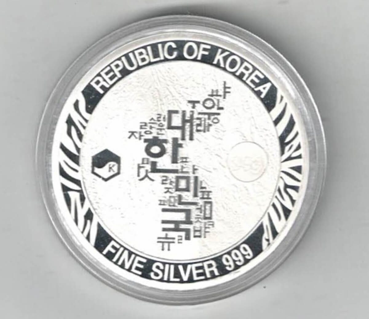The obverse features a young tiger charging on a prey in the Hallasan mountain of Jeju-do in South Korea. The reverse features an image of the Korean Peninsula.