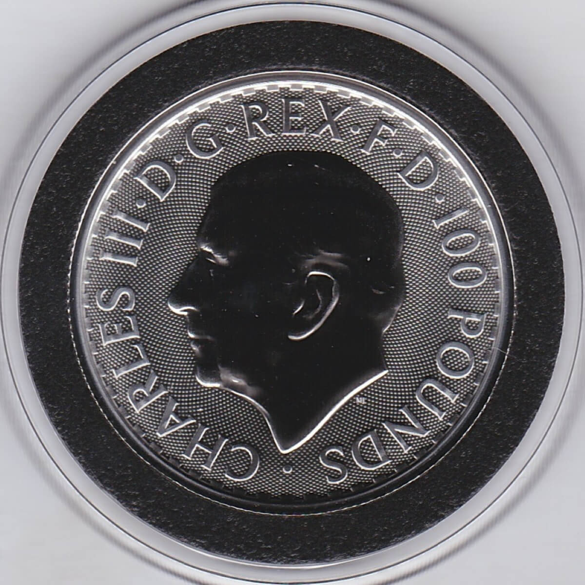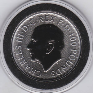 The obverse of this one ounce Platinum coin features the portrait of King Charles III facing left, with legend around. The reverse features the iconic standing figure of Britannia with trident and shield, with legend around.