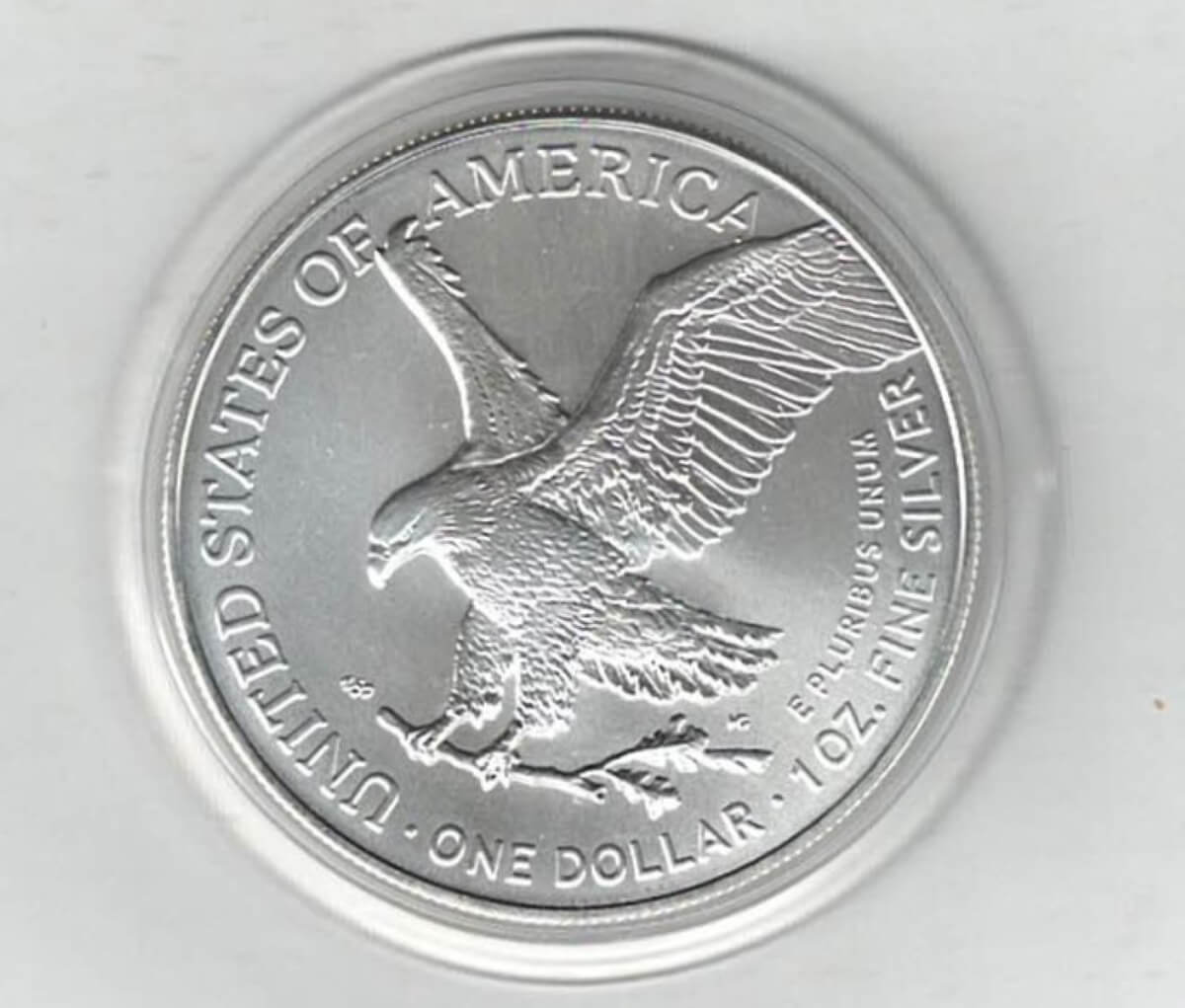 The 2024 Eagle is a coin struck in fine silver by the US Mint . The obverse features the Liberty in full stride. The reverse features the eagle carrying an oak branch.