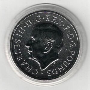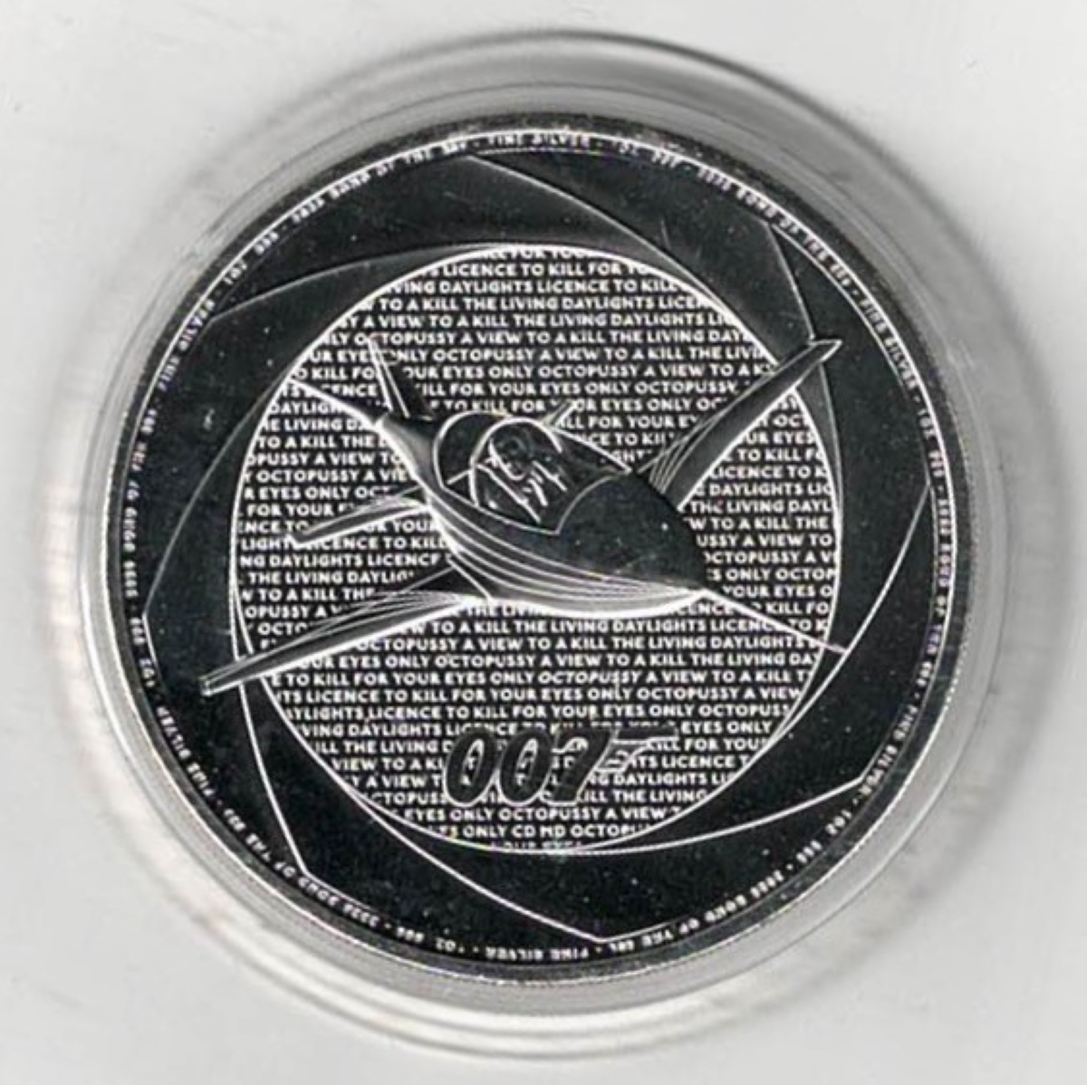 This 2025 coin struck in fine silver by the Royal Mint. The obverse features the portrait of Charles III Facing left. the reverse features a depiction of James Bond’s acrostar airplane from the movie ‘Octopussy’, set against a background of James Bond titles from the 1980s and the inscription ‘007’.