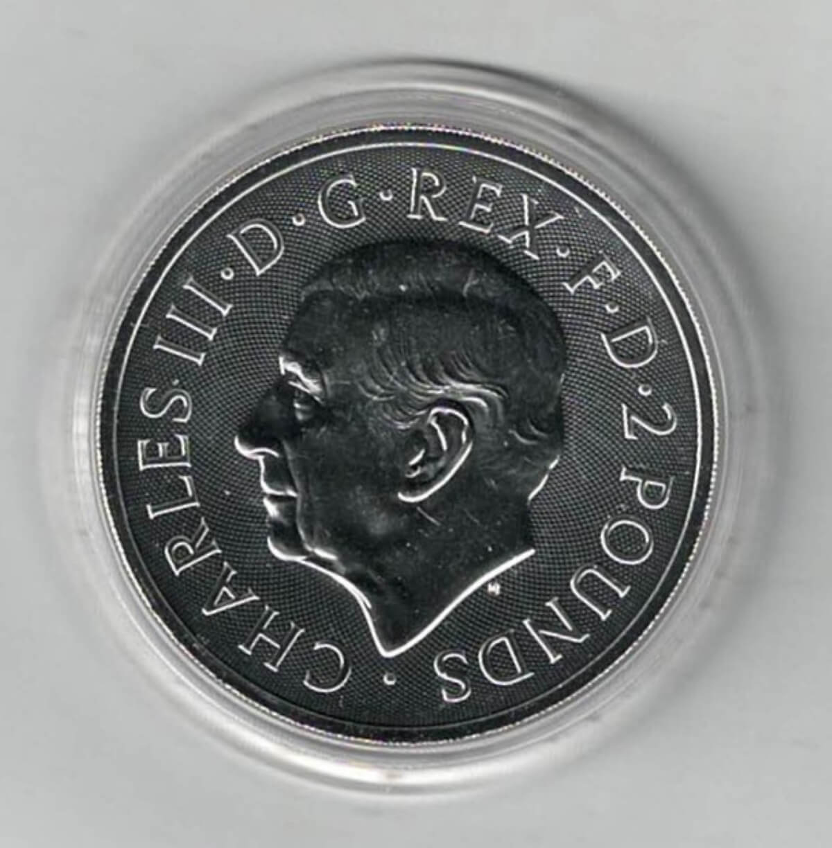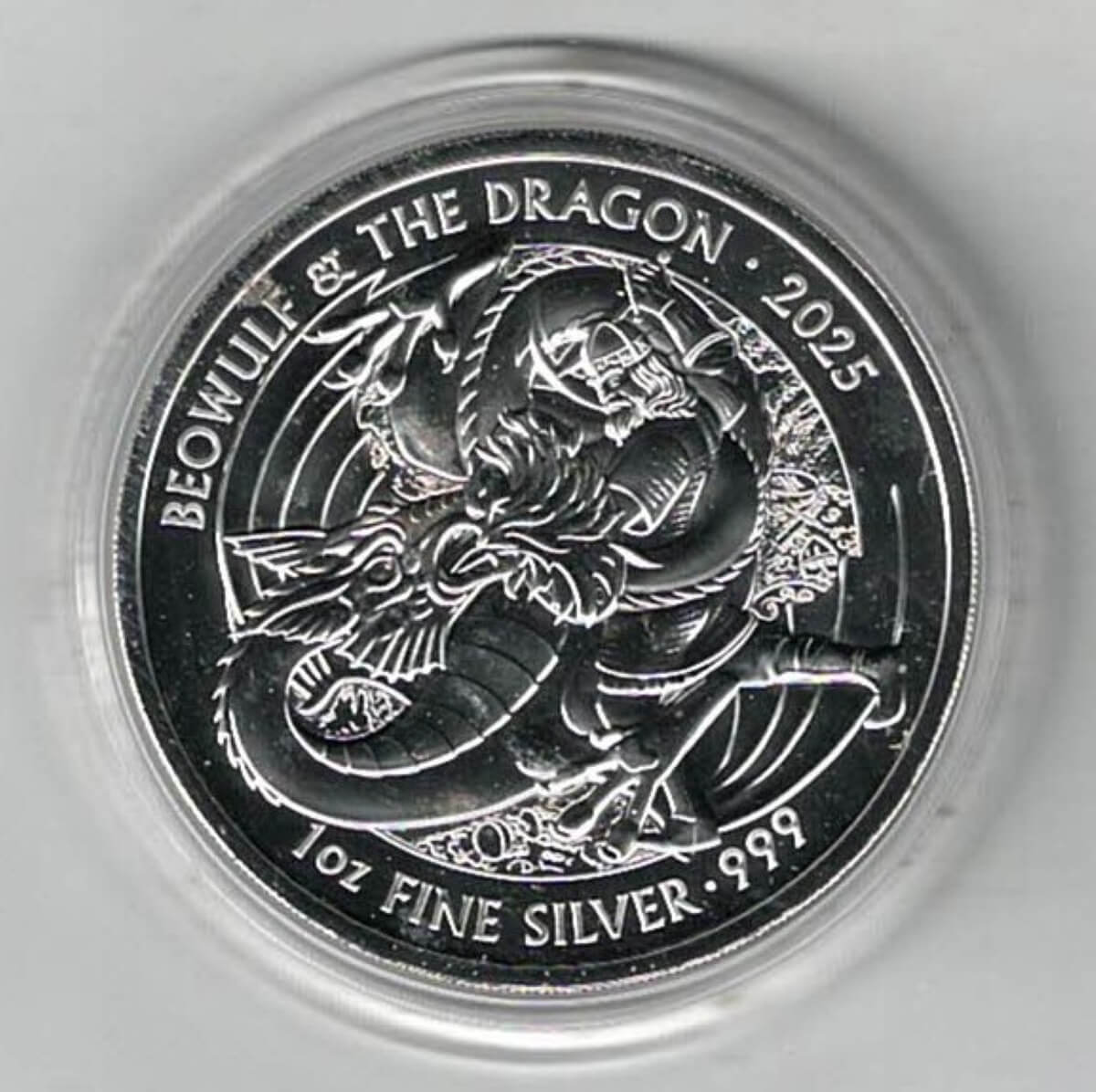This 2025 coin struck in fine silver by the Royal Mint. The obverse features the uncrowned portrait of Charles III facing to the left. The reverse features Beowulf and the Dragon fighting.
