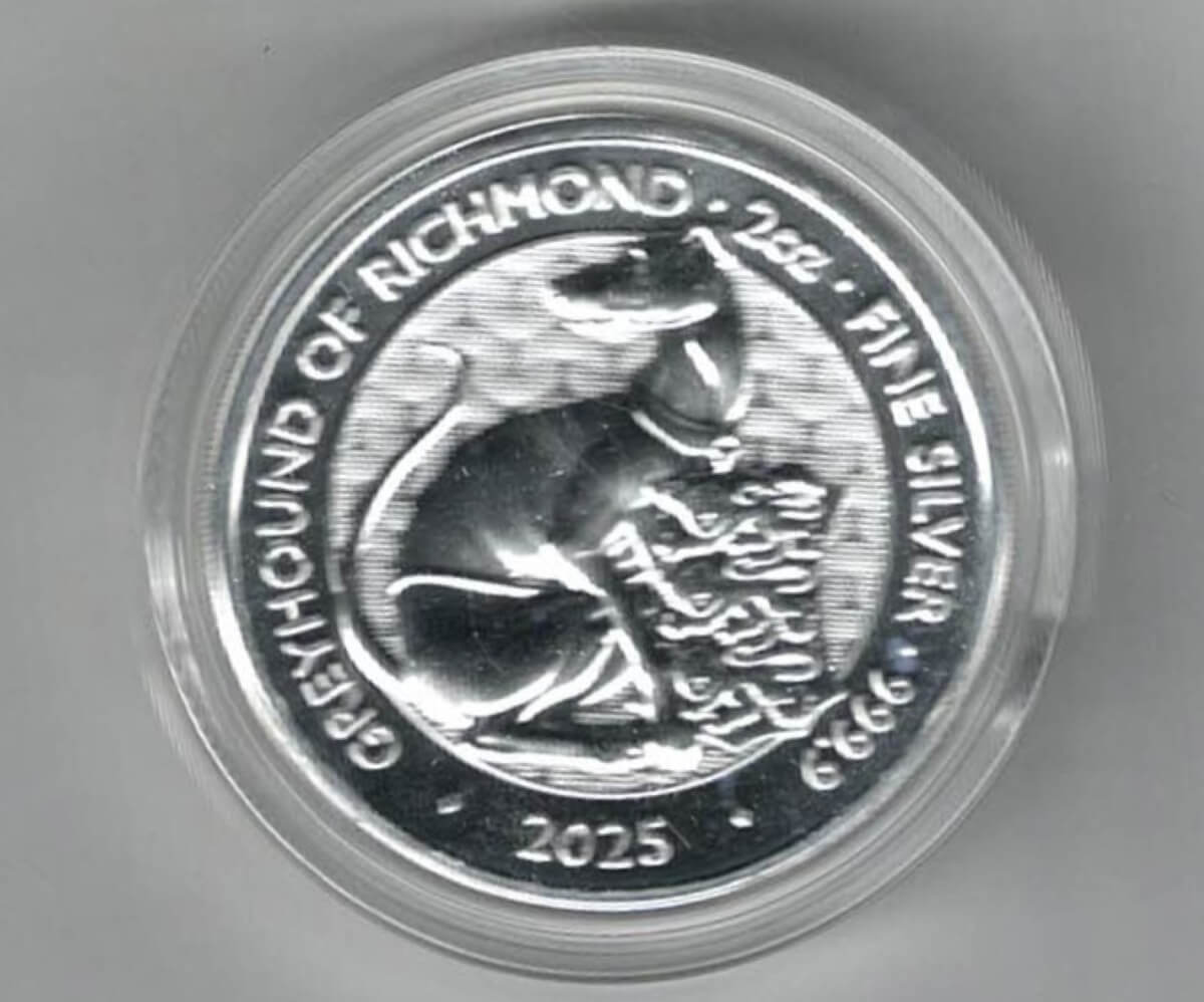 2025 Silver Two Ounce Coin Greyhound Of Richmond In Mint Condition.