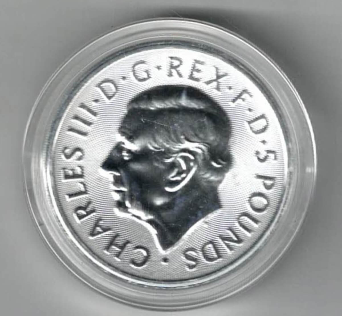 The obverse features the portrait of Charles III facing left. The reverse features a depiction of the Greyhound of Richmond with a shield featuring three lions within the royal arms.