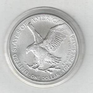 The 2025 Eagle is a coin struck in fine silver by the US Mint . The obverse features the Liberty in full stride. The reverse features the eagle carrying an oak branch.