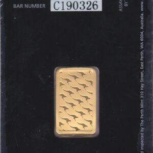 The bar features the Perth Mint Australia logo, the weight and gold fineness on one side. The other side features kangaroos.