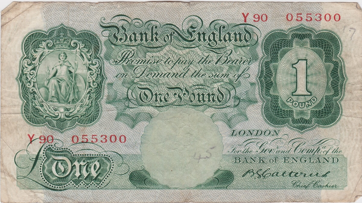 This is the series A Britannia one pound banknote issued on 15th July 1930 with prefix / serial number Y90 055300.