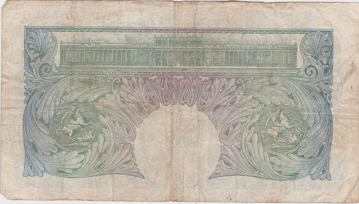 The B225 One Pound banknote was issued by the Bank of England in 1930. This green note features a seated figure of Britannia at upper left on the obverse. The reverse features the Bank of England building at the top with two Sovereigns at the left and right.