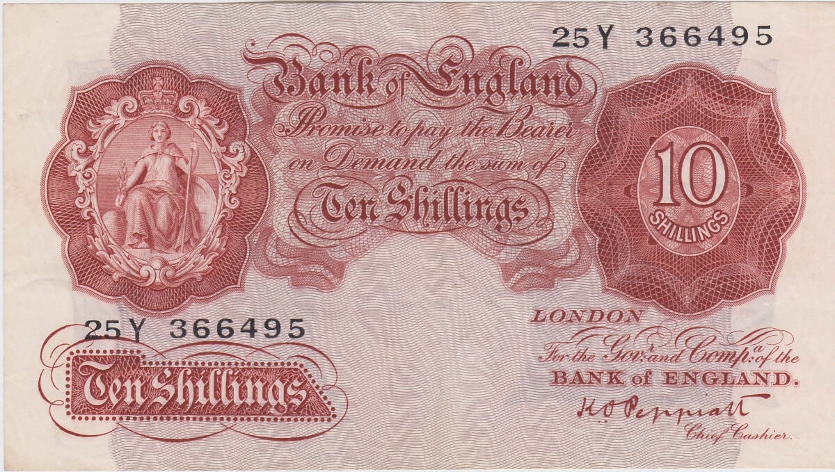 B236 Peppiatt Ten Shillings Banknote. This is the 1934 issue, with Britannia at the left on the obverse. Prefix / Serial Number 25Y 366495.B236 Peppiatt Ten Shillings Banknote – 25Y