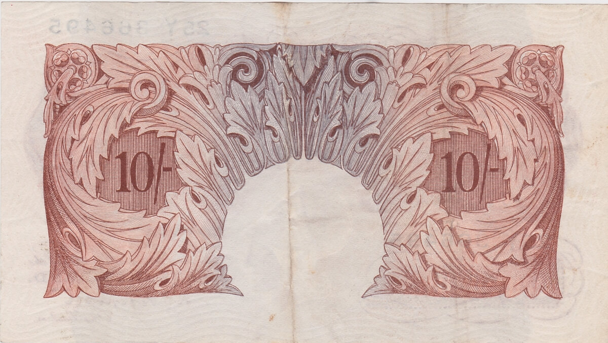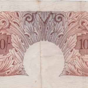 The B236 Ten Shillings was issued by the Bank of England in 1934. The note is brown-violet and brown on grey and pink underprint. The obverse features a seated figure of Britannia at left. The reverse shows the denomination within leaf designs.