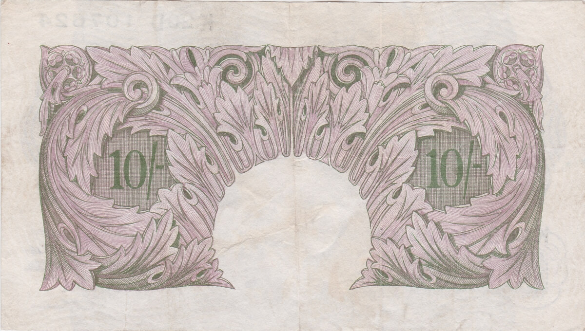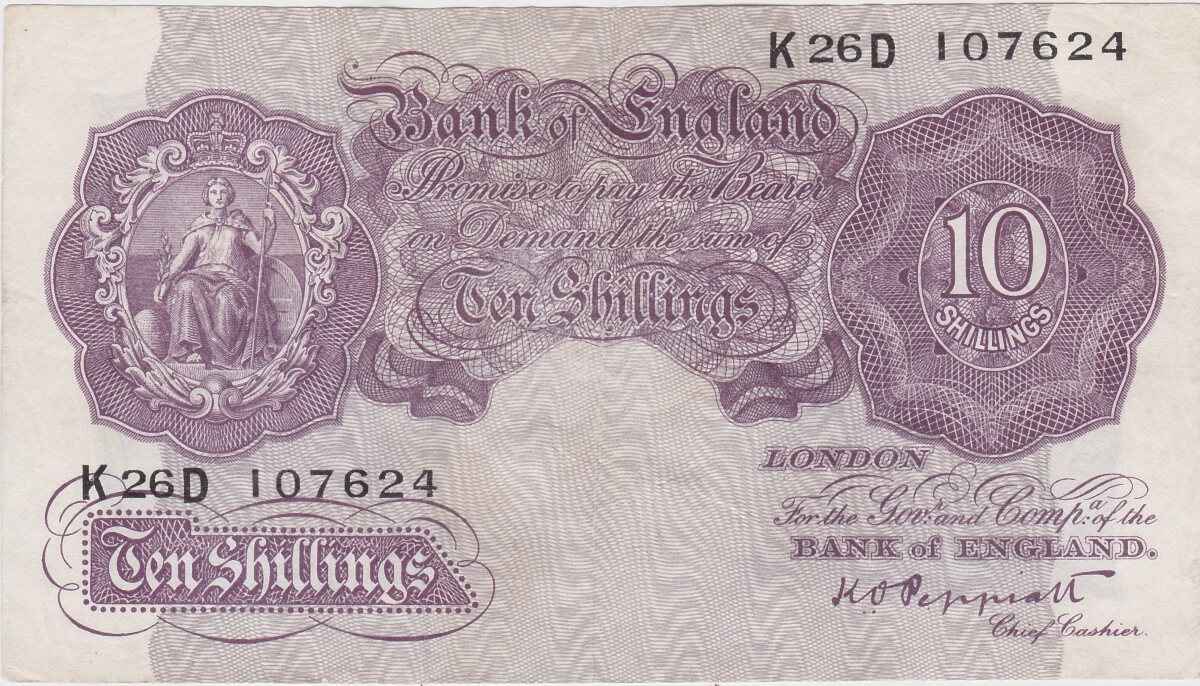 B251 Peppiatt Ten Shillings K26D Banknote. This is the 1940 issue, with Britannia at the left on the obverse. Prefix / Serial Number K26D 107624.B251 Peppiatt Ten Shillings K26D Banknote
