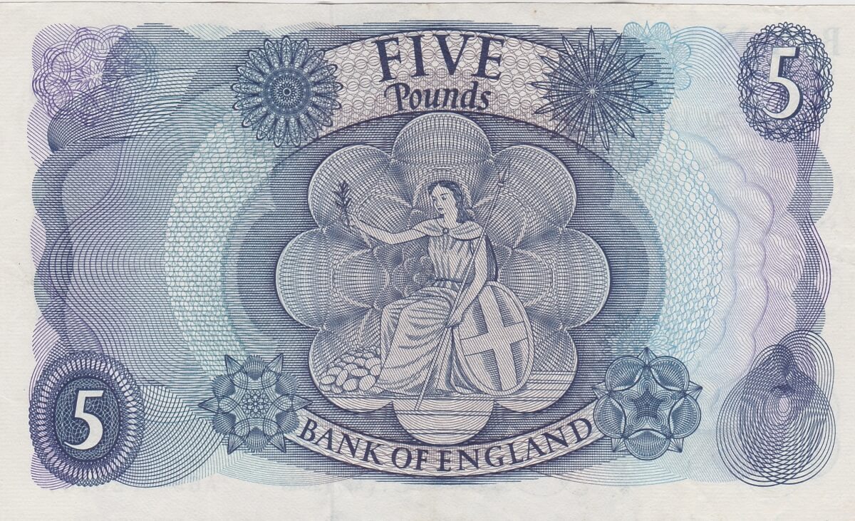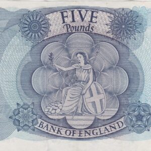 The B297 Hollom banknote was issued by the Bank Of England. This note is deep blue on multicolour underprint. The portrait of Queen Elizabeth II at the right on the obverse. The reverse features a seated figure of Britannia with a shield, spear and olive branch, within 8-petalled pattern at centre.