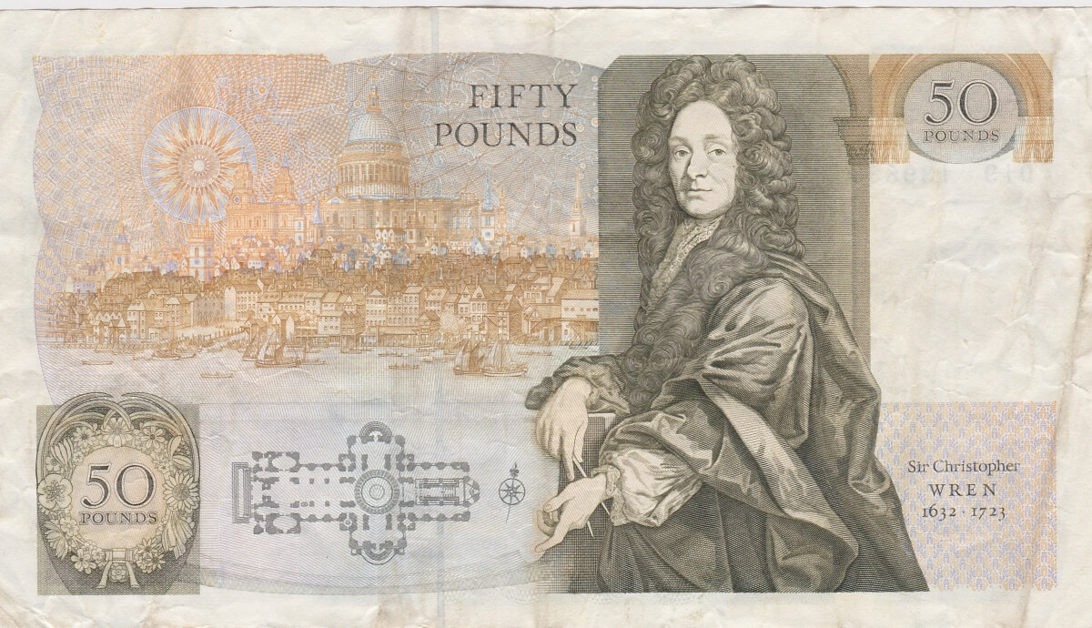 This banknote was issued in 1988 with Prefix / Serial Number D19 139636 and features Sir Christopher Wren 1632-1723.