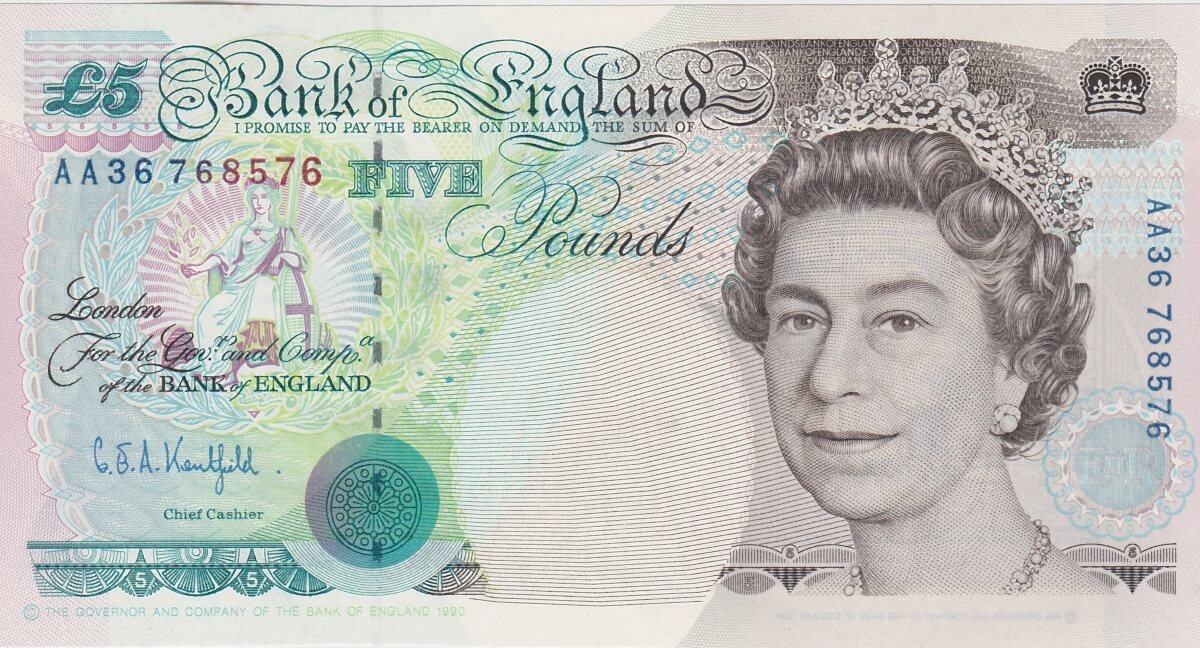 There is no writing, repairs, pin holes or tears on this five pounds banknote.