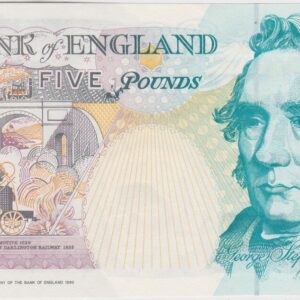 The B363 banknote was issued by the Bank Of England. This note is dark brown and deep blue-green on multicolour underprint. The portrait of Queen Elizabeth II at right, with a seated figure of Britannia at the left. The reverse features George Stephenson at the right and the Rocket locomotive at the left.