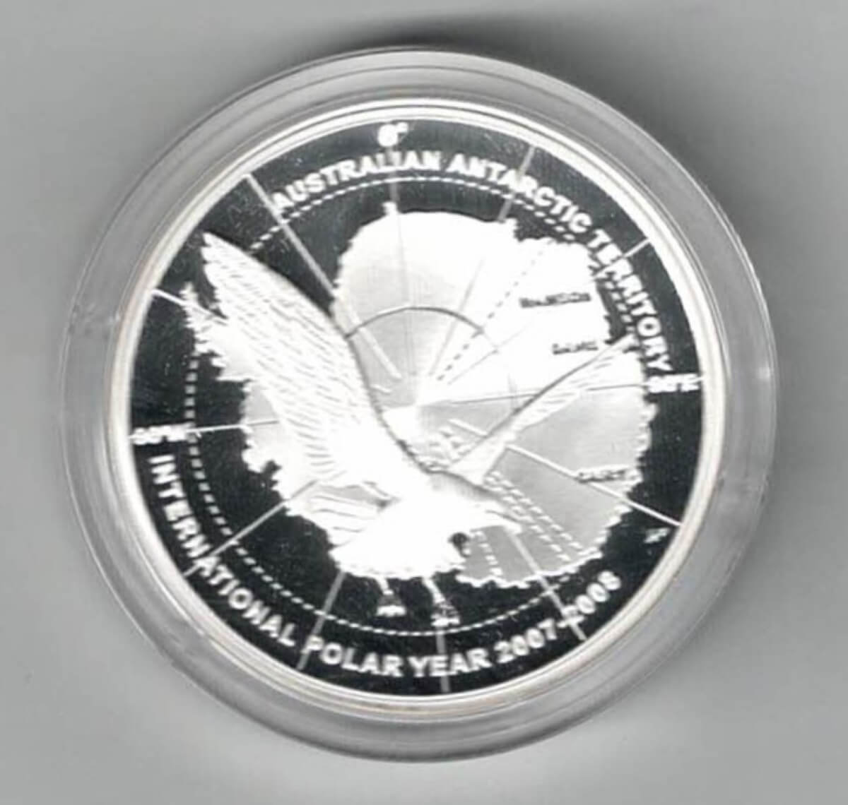 This 2008 coin was struck in fine silver by the Royal Australian Mint . The obverse features Elizabeth II facing Right. The reverse features a Skua bird in flight over a map of Antarctica.