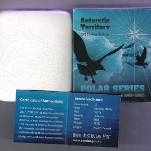 The international polar year 2007-2008 is an internationally coordinated research campaign initiating a new era in polar science. This 2008 coin is one of a series of four developed in conjunction with the Royal society of Victoria, celebrating Australia’s connection with Antarctica.