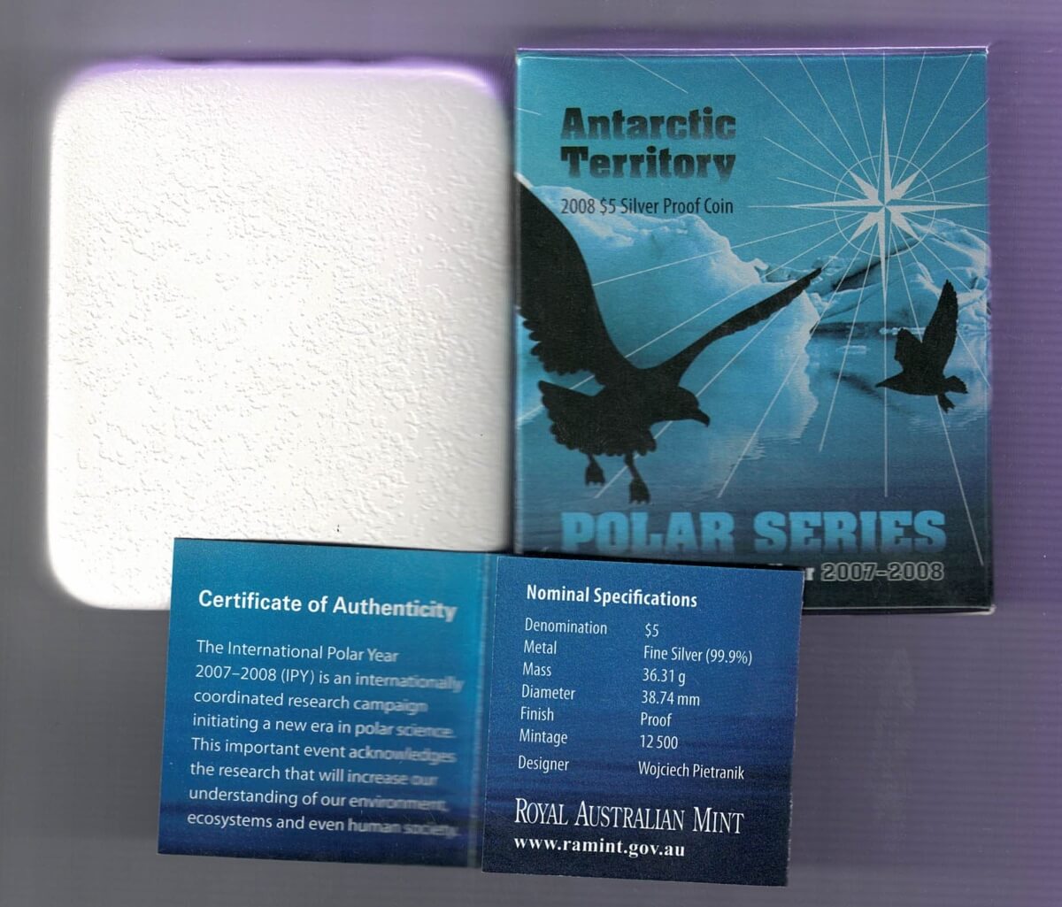 Boxed 2008 Australia Antarctic Territory Silver Proof Five Dollar Coin In Mint Condition.