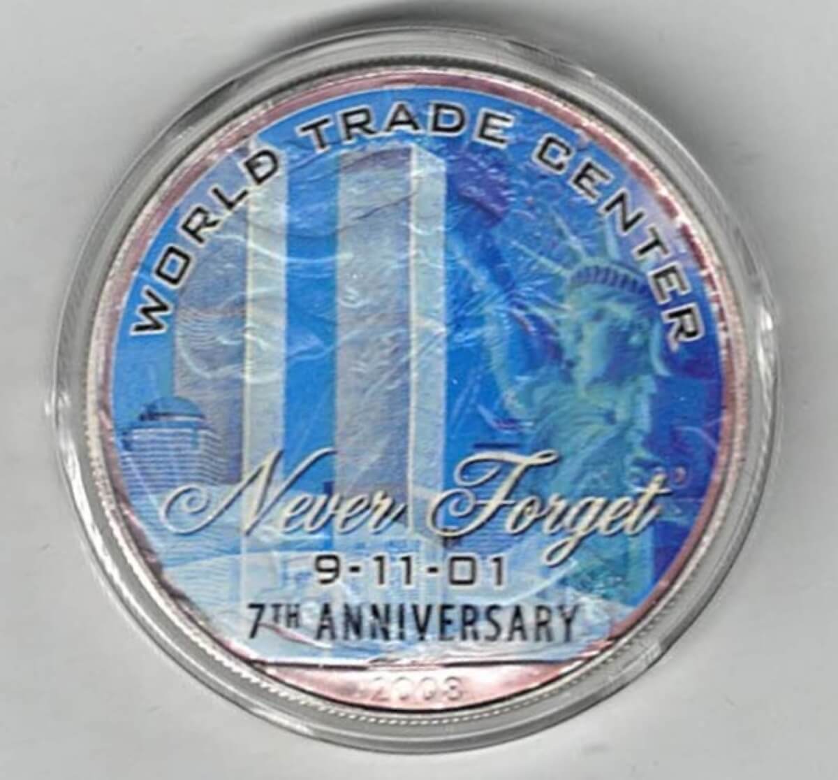 Boxed 2008 Silver USA One Ounce Eagle Colourised World Trade Centre (9/11 Twin Towers) 7th Anniversary Coin In Near Mint Condition.