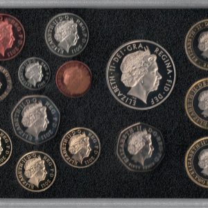 The coins in this set contains the range of UK coins from the 1p to the £5. Each Coin in this collection features the portrait of the Queen Elizabeth II. All coins in this collection have been struck to Proof Quality.