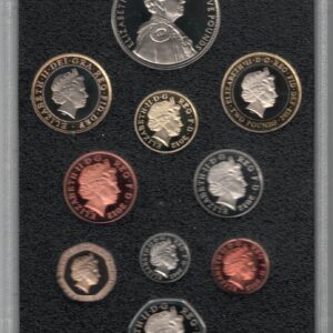 The coins in this set contains the range of UK coins from the 1p to the £5. Each Coin in this collection features the portrait of the Queen Elizabeth II. All coins in this collection have been struck to Proof Quality.