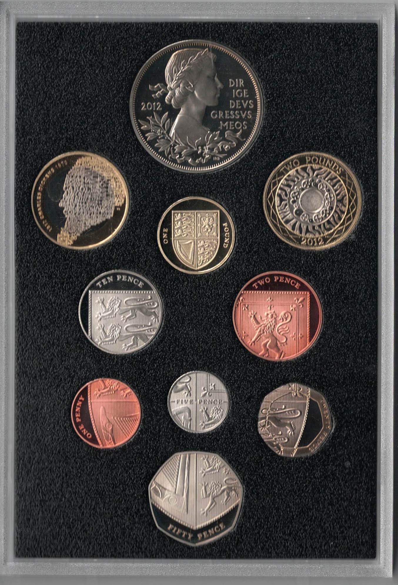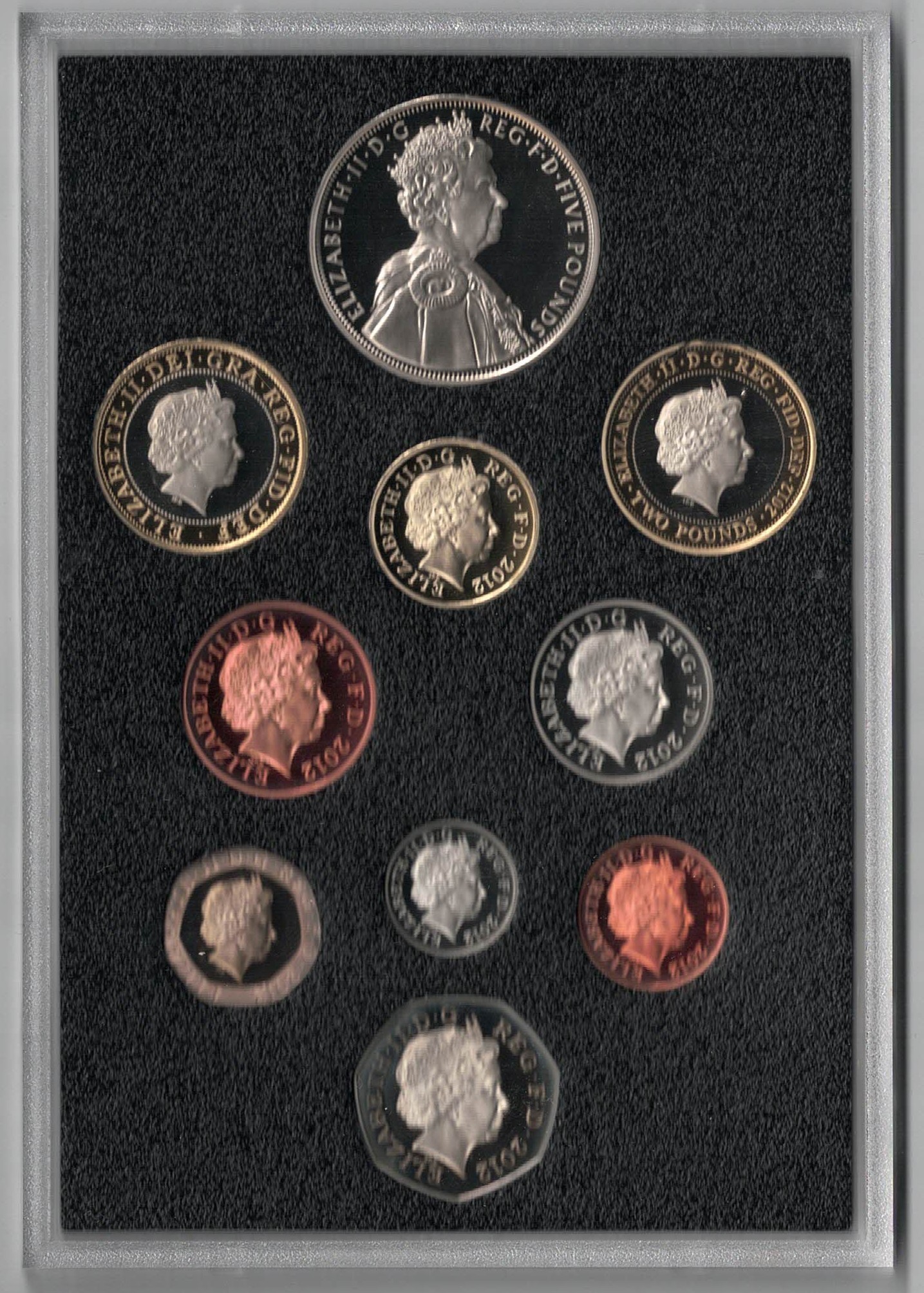 The coins in this set contains the range of UK coins from the 1p to the £5. Each Coin in this collection features the portrait of the Queen Elizabeth II. All coins in this collection have been struck to Proof Quality.