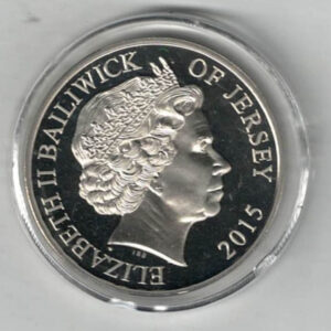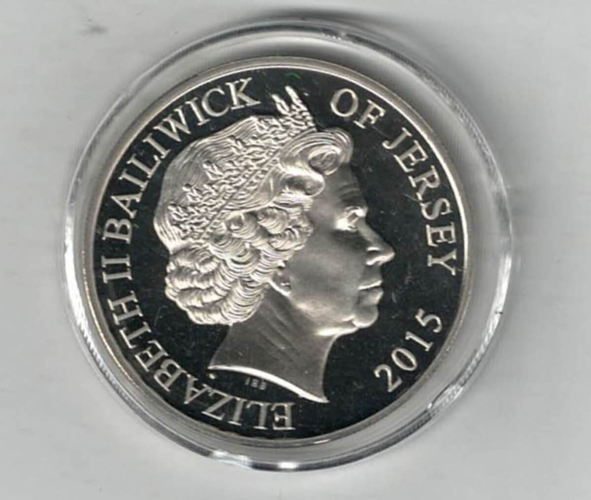 Boxed 2015 Jersey Nickel Proof Churchill Five Pound Coin. The obverse side of the coin features the portrait of Queen Elizabeth II.Boxed 2015 Jersey Nickel Proof Churchill Five Pound Coin